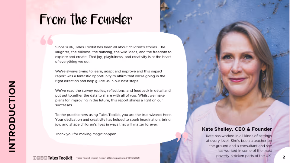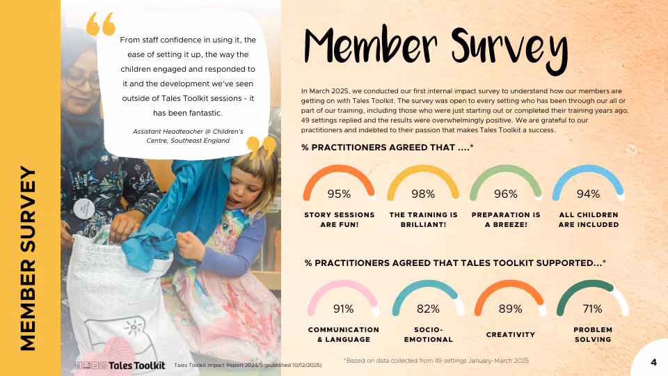 Since the creation of Tales Toolkit, we've taken pride in our strong foundation of research that shows the real-world impact of Tales Toolkit on both practitioners and children. Our research partners have included the Education Endowment Foundation, Goldsmiths University of London, The Mercers Company and the Institute of Employment Studies.